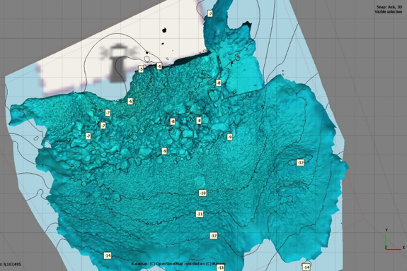 BM modeling project: BM was assigned the task of locating and retrieving an anchor along with two lengths of chain that had become lost in a complicated rocky seabed in the Aegean Sea. To search for, detect, and determine the geolocation of the anchor and chain, an ROV equipped with advanced detection sensors (including Multibeam Imaging Sonar and UHD cameras) and navigation equipment (USBL and DVL) was utilized. A 3D model of the anchor and chain layout on the intricate rocky terrain was developed to aid our divers in executing a successful salvage plan.